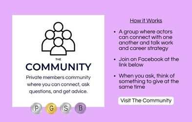A wonderful community of actors at all stages in their careers, with coaching, tips, casting director Zooms, wellness Zooms, and monthly member virtual catch-ups.